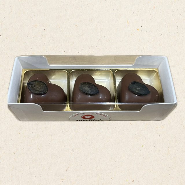 Herzpraline – gefüllt mit gerösteten Kürbiskernen, weisse Couvertüre und Engelshaar